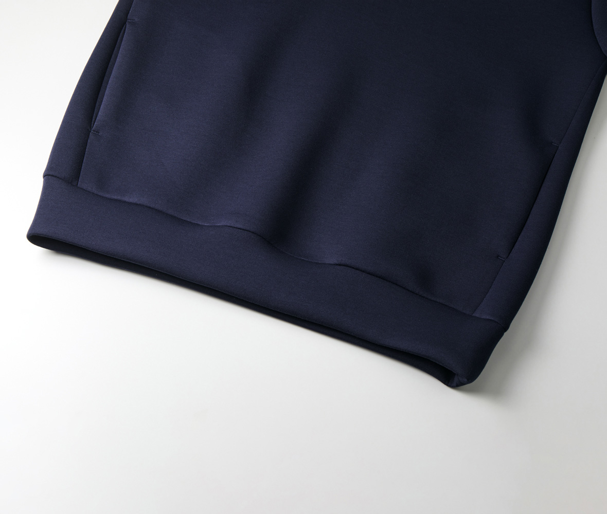 クッション性のあるダンボールニット生地は表糸にレーヨンを混ぜ込むことで、ほどよいやわらかさと光沢感、きれいな生地目を実現。
