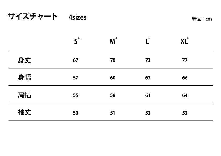 サイズ展開はS⁺ M⁺ L⁺ XL⁺になります。
